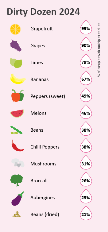 Using government monitoring data from Pesticide Residues in Food (PRiF) andHealth and Safety Executive (HSE), PAN UK publishes its own Dirty Dozen list, highlighting products in which multiple pesticide residues are most frequently detected. Unlike EWG, PAN UK does not publish a “Clean Fifteen” equivalent, stating that UK monitoring data do not support the reliable identification of products with consistently low exposure.