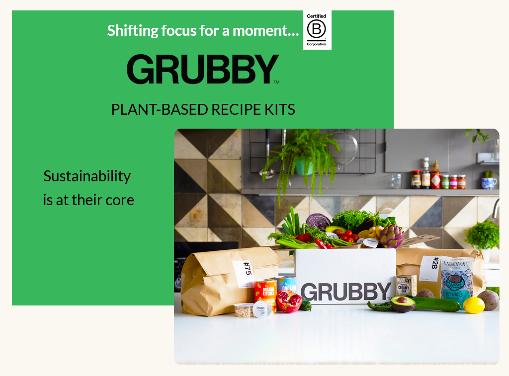 – Grubby“Fundamentally, we are the only authentically 100% plant-based recipe box […] We want to be seen as the authority in plant-based cooking. People get our recipe kits because they see that we’re the experts. Yes, there are others with good plant-based recipes, but ultimately, it’s not their focus. With us, it’s the only thing we’re doing, our only focus and it’s always going to be that, along with having a much more sustainable proposition they can trust.”